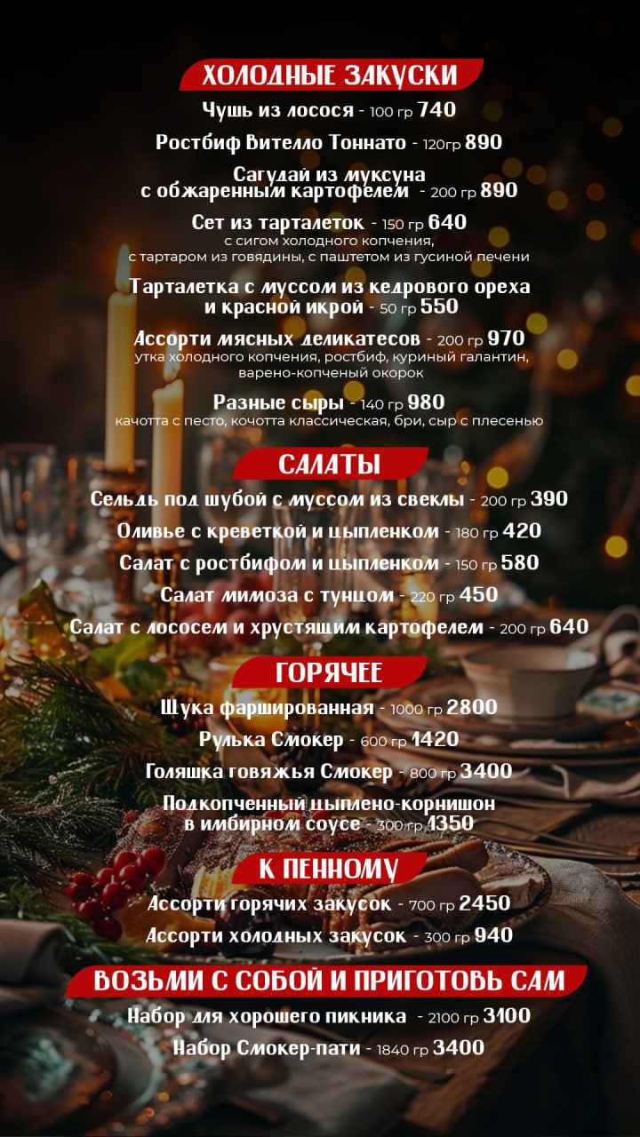 - горячее: фаршированная рыба, мясо Smoker, рулька, голяшка 🔥